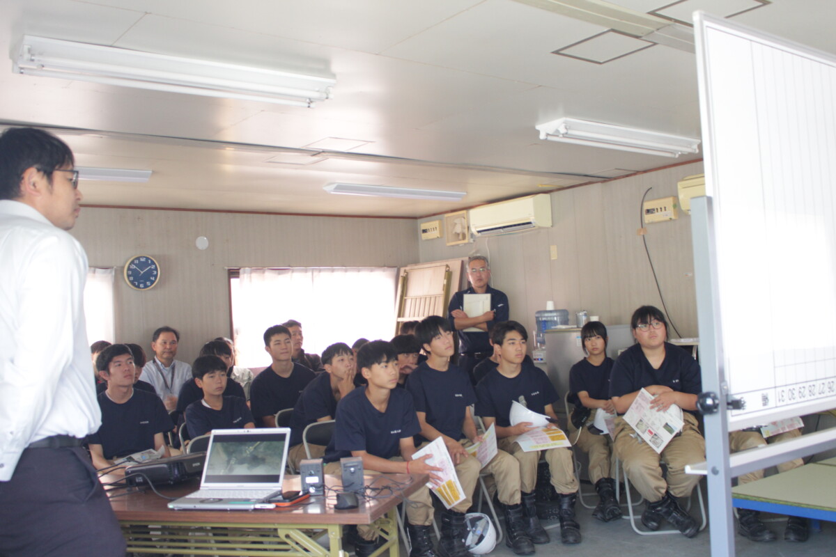 その後、曽於南部土地改良区で、土改連と県が農業土木技術者として、どのような仕事をしているのか、また、昨年卒業し県職員となった農高OBから農業土木職としてどのように働いているのか実体験をもとにした説明を受けました。
