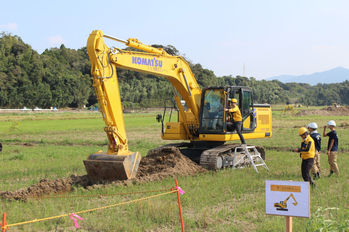 その後、東串良町の「岩弘地区」に移動し、施工業者の吉留組協力のもと、本地区で実施されている「水田ほ場整備事業」について、県大隅地域振興局農村整備課の担当職員から「区画形状や農道が狭小で農作業に支障があるため、大型機械の導入と農地の担い手への集積により、地域農業の発展を目指して実施している」こと等が説明されました。また、コマツカスタマーサポート(株)の担当者から建設業界が取り組んでいる、ICT技術の活用や、労働環境向上の取り組みについて説明を受けました。