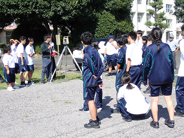 その後、学校に戻り、測量体験を行いました。地元の林建設株式会社の職員が講師を務め、プログラムにより自動で撮影を行うドローンや自動追尾のカメラを備えた測量機材など最先端の機器が紹介され、生徒達は興味津々の様子で体験に参加していました。